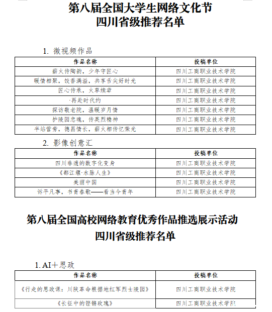 按照《中共四川省委教育工作委员会、中共四川省委网络安全和信息化委员会办公室关于举办第八届四川大学生网络文化节和四川高校网络教育优秀作品推选展示活动的通知》安排,经个人申报、学校推荐、专家评审,近日推荐857件四川大学生网络文化作品、182件四川高校网络教育作品参评“第八届全国大学生网络文化节和全国高校网络教育优秀作品推选展示活动”。在党委宣传部的牵头组织下,我院共有《美丽中国》《长征中的铿锵玫瑰》《护陵园忠魂,传英烈精神》等13个作品入围省级推荐的作品名单,将代表四川省参加全国大学生网络文化节和全国高校网络教育优秀作品的推选展示活动,创造了参加此项活动的最好成绩。