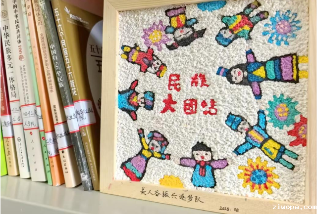 会后,实践队员们手持扫帚、抹布,对磨子沟村图书室进行了彻底的清扫与分类整理,并捐赠爱国教育、民族文化、农学技能、趣味百科等书籍200本,与村委会结对共建“民族团结图书角”。在共建仪式上,团队还特别赠予磨子沟村由队员们亲手制作的“民族大团结”主题纸浆画,画作生动展现了各民族守望相助、和谐共处的美好图景,成为图书室亮丽的风景线,也成为连接高校与乡村的文化桥梁。