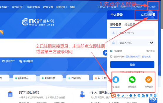 1、如已有知网个人账户,直接登录个人账号即可绑定;如无个人账号,选择注册,注册完毕后再登录个人账号完成账号绑定。