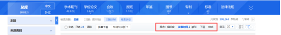 5. 【排序功能的选择】可根据相关度、发表时间、被引、下载等指标进行排序。